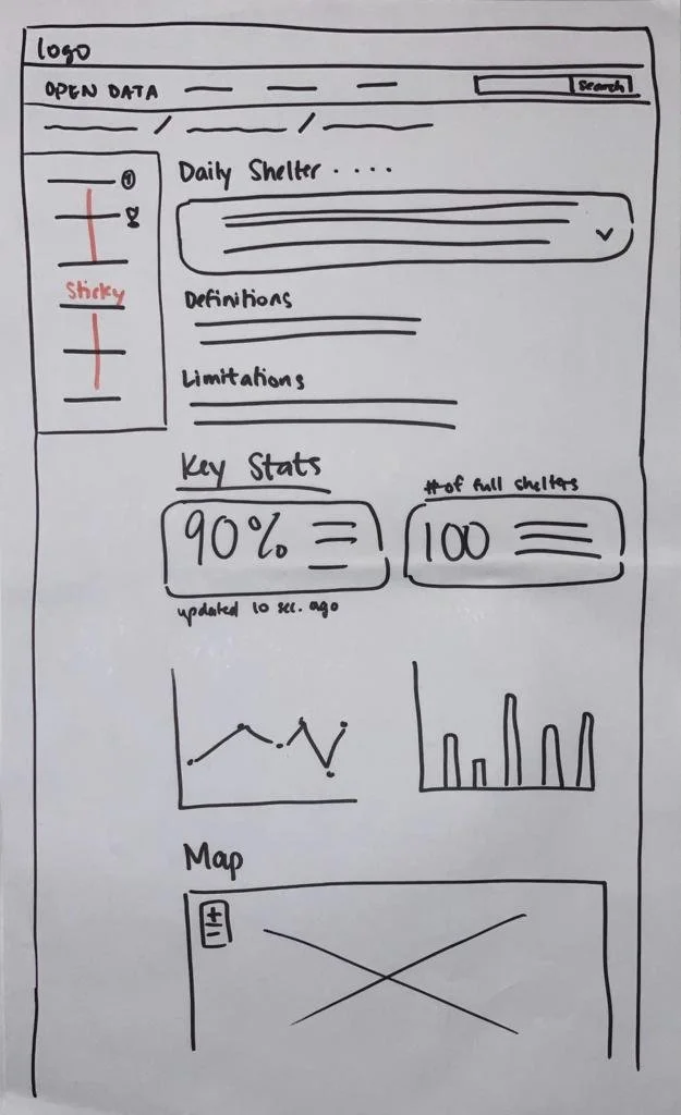 Once we knew the task, I sketched a couple of potential design solutions that we could implement. We knew we wanted to keep Open Data as a webpage since that is how users usually access it, so that helped to guide my layout.