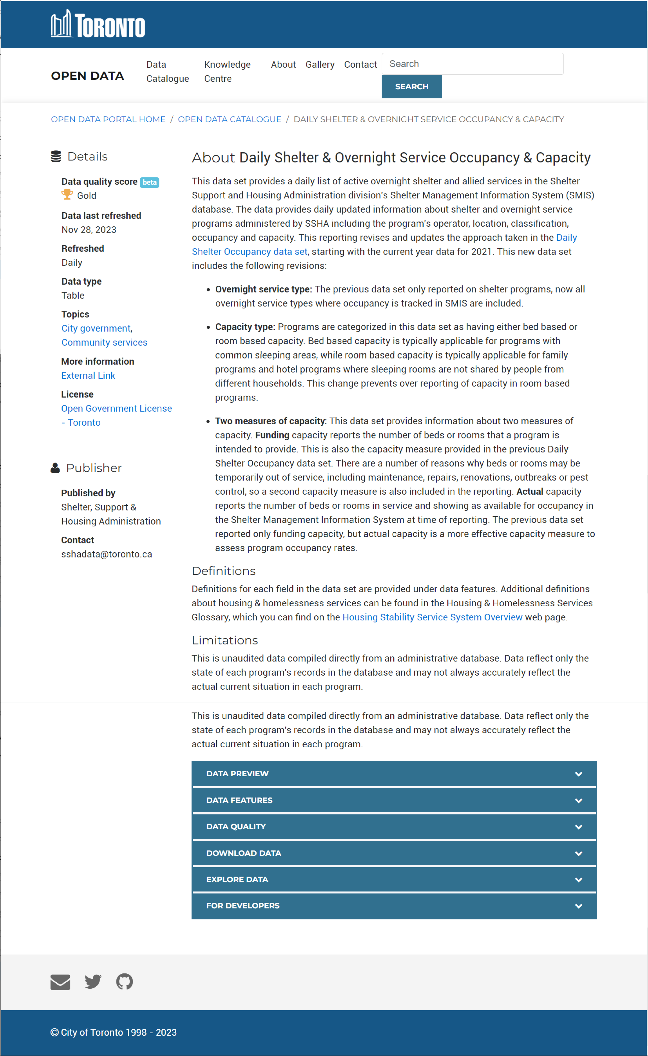 We ended up picking the dataset with the longest name known to man, Daily Shelter & Overnight Service Occupancy & Capacity. We believed it was the best choice because it contains information that is inherently valuable to both the city and public, so now we just had to figure out how to present it.