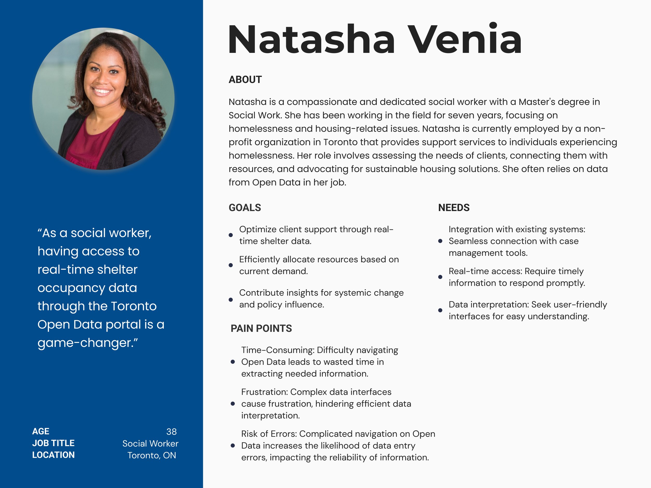 Natasha is a social worker who relies on Open Data to find information to help her clients find places to stay overnight, but struggles with understanding the website’s interface and meaning of the data, effectively preventing her from helping her clients when they need her the most.