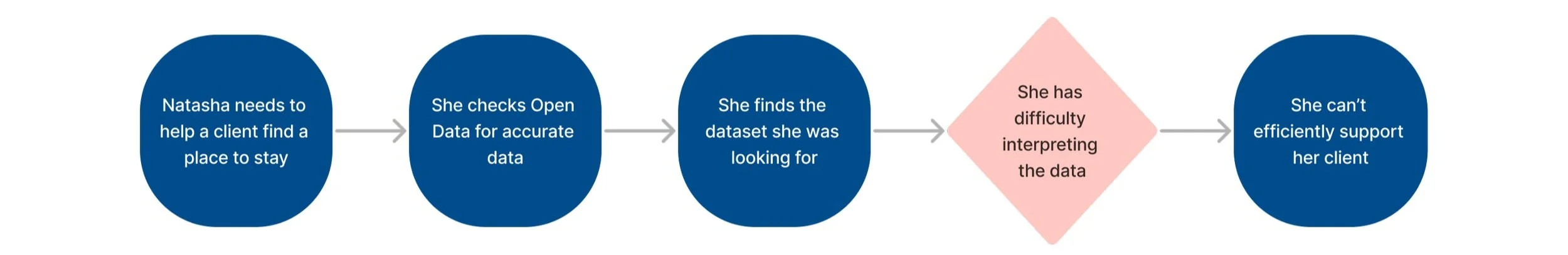 However, Natasha has notable pain points. If you look closely, you’ll notice that she has multiple struggles with Open Data, namely that using it is time-consuming, the interface is frustrating, and she is prone to errors due to the unintuitive navigation.